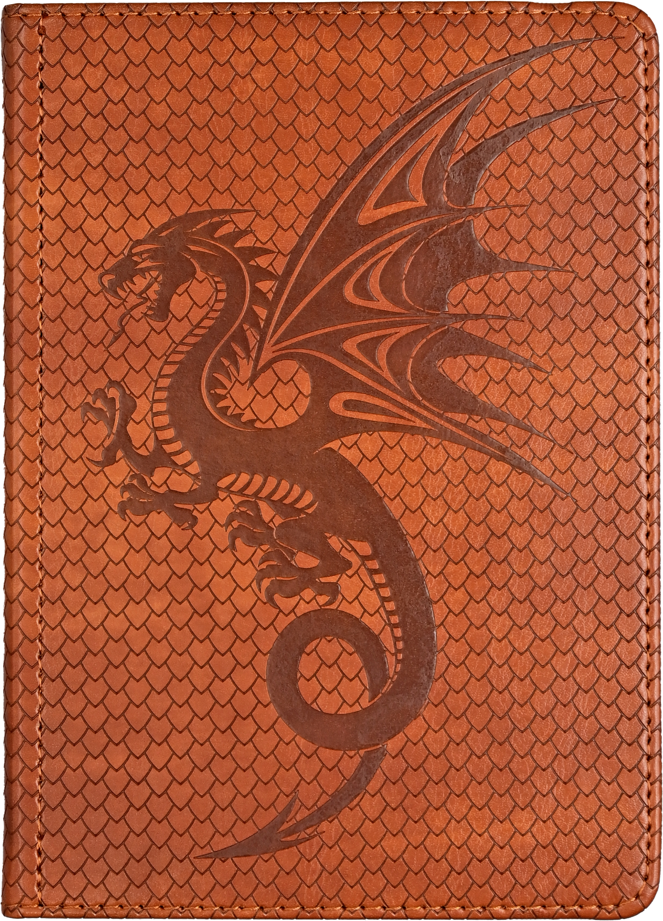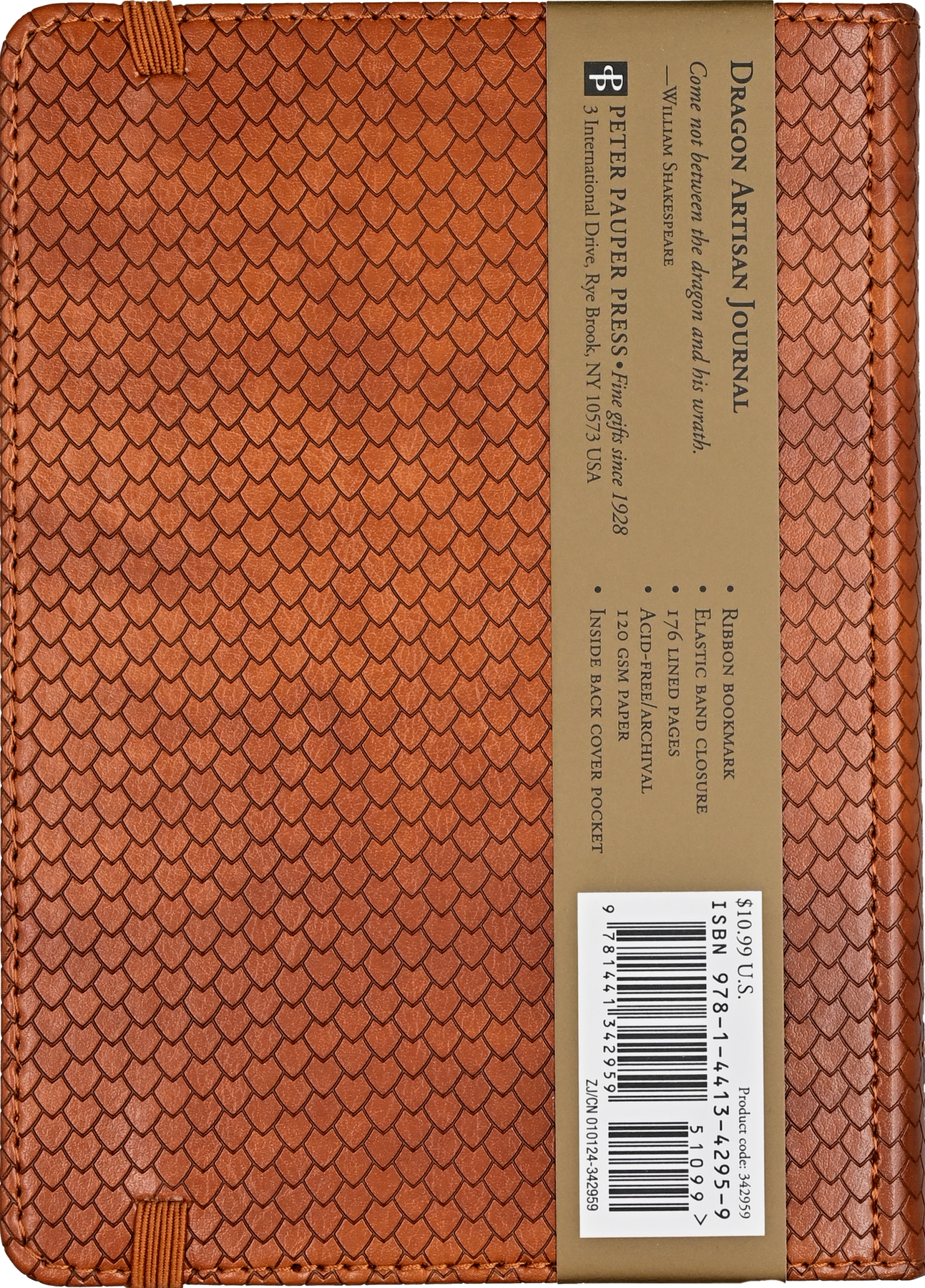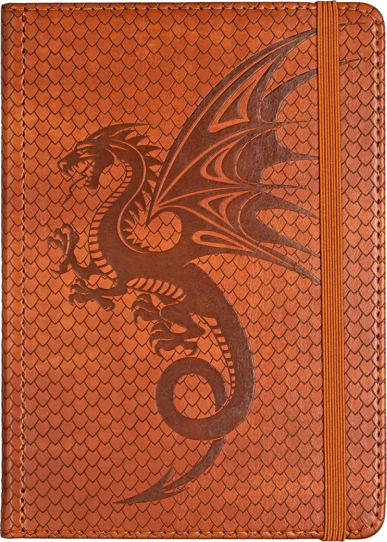 A formidable dragon guards the pages of this elegant journal. • The journal's soft vegan leather covers feature a decorative stitched pattern resembling dragon scales! • Inside, crisp writing pages are ideal for personal reflection, sketching, or for jotting down favorite quotations or poems. • Premium 120 gsm paper takes pen or pencil beautifully. • Paper is acid free and of archival quality. • Light gray lines subtly guide your writing. • A ribbon bookmark keeps your place. • A pocket inside the back cover expands to hold notes, cards, mementos, and more. • A matching elastic closure secures your journal. • Complementary interior endpapers. • Sturdy hardcover binding. • Binding has rounded cover corners for reduced wear. • Journal measures 5'' wide x 7'' high. • Compact size fits easily in most bags and backpacks.