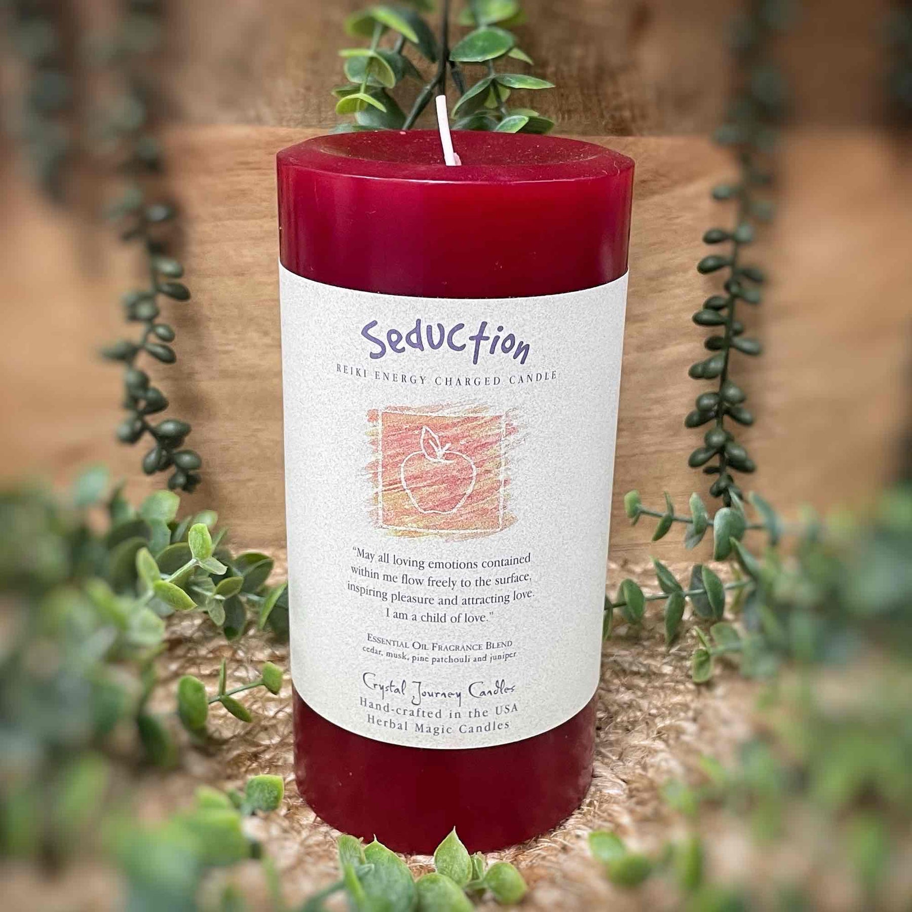 The Seduction candle includes a blend of Cedar, Musk, Pine, Patchouli and Juniper essential oils, with the affirmation: "May all loving emotions contained within me flow freely to the surface, inspiring pleasure and attracting love. I am a child of love".