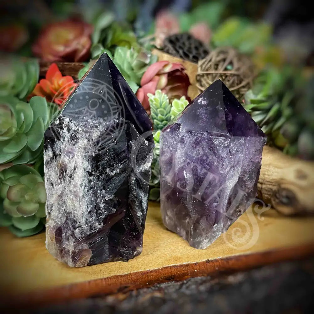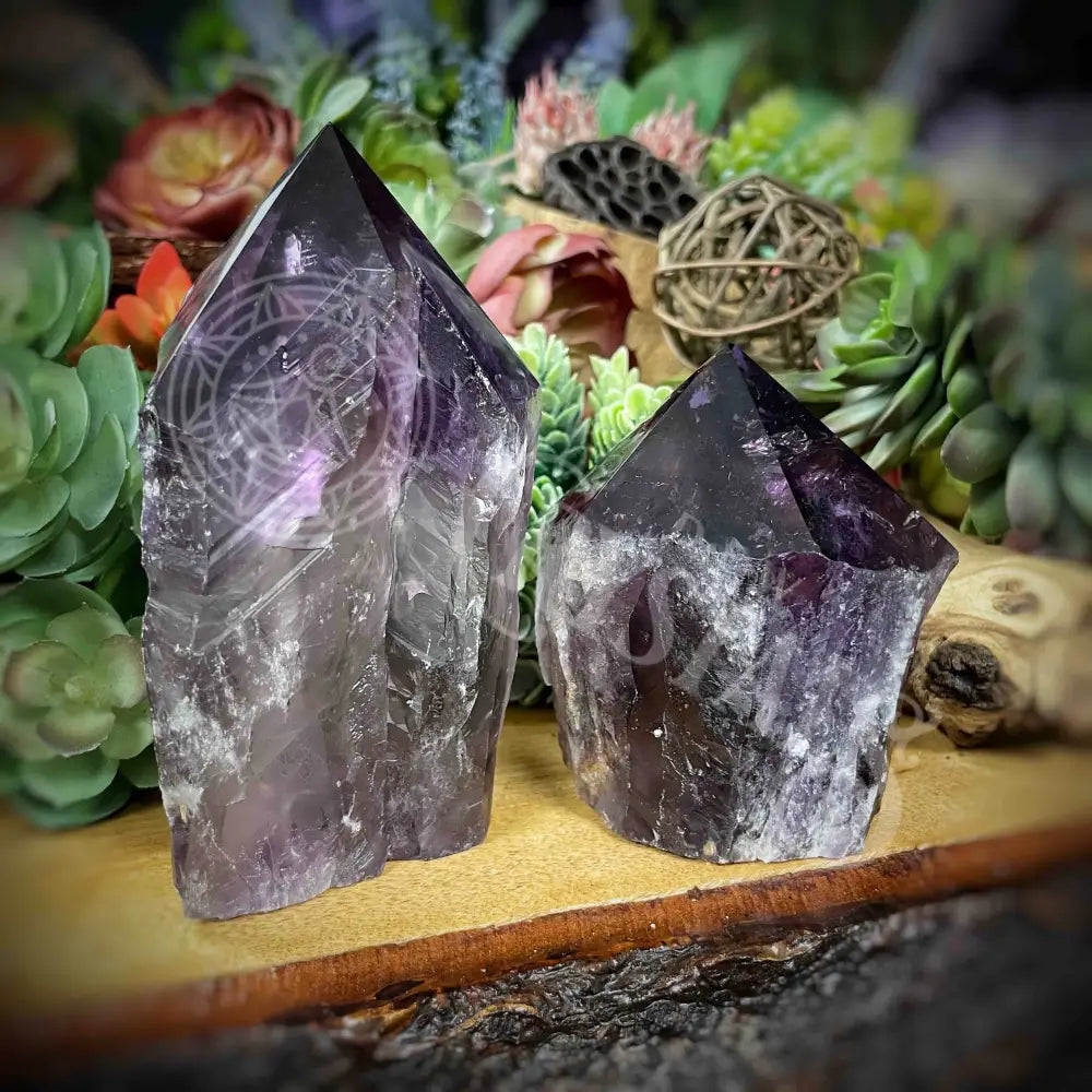 These beautiful Amethyst points have a polished top, rough cut sides with a flat bottom base.  They are perfect for crystal grids, ritual tables, even decoration.  See below for the metaphysical properties of Amethyst.