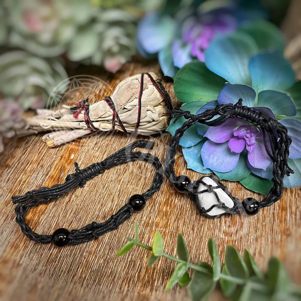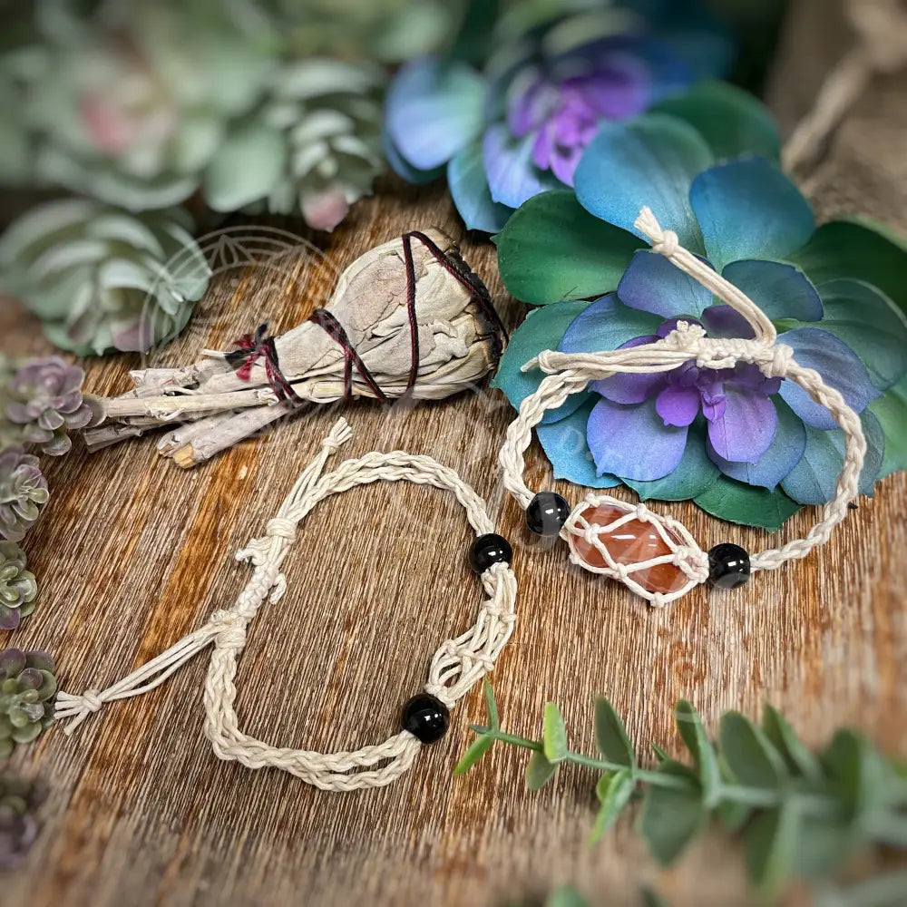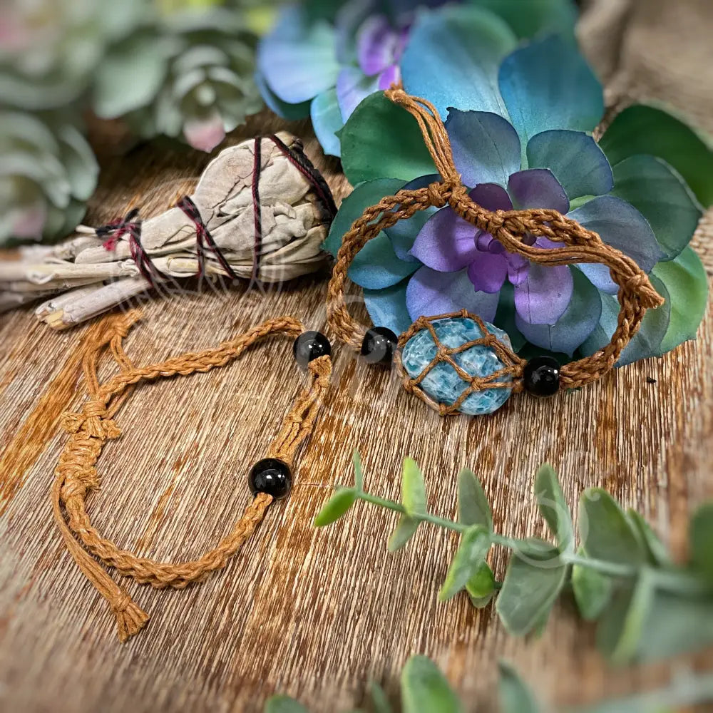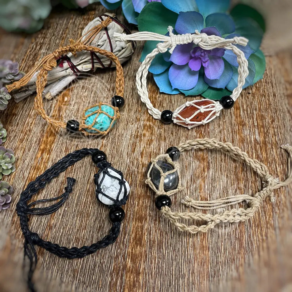 Available in black, brown, tan or cream, this bracelet securely holds medium-sized crystals, keeping them protected, accessible and easily changeable.