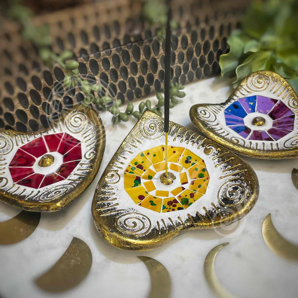 Add a touch of love and elegance to your sacred space with the Mosaic Heart Incense Holder. Crafted in the shape of a heart, this stunning holder features a mesmerizing mosaic design that shimmers beautifully as it catches the light. Perfect for holding your favorite incense sticks, it creates a serene and soothing ambiance while enhancing your home decor.