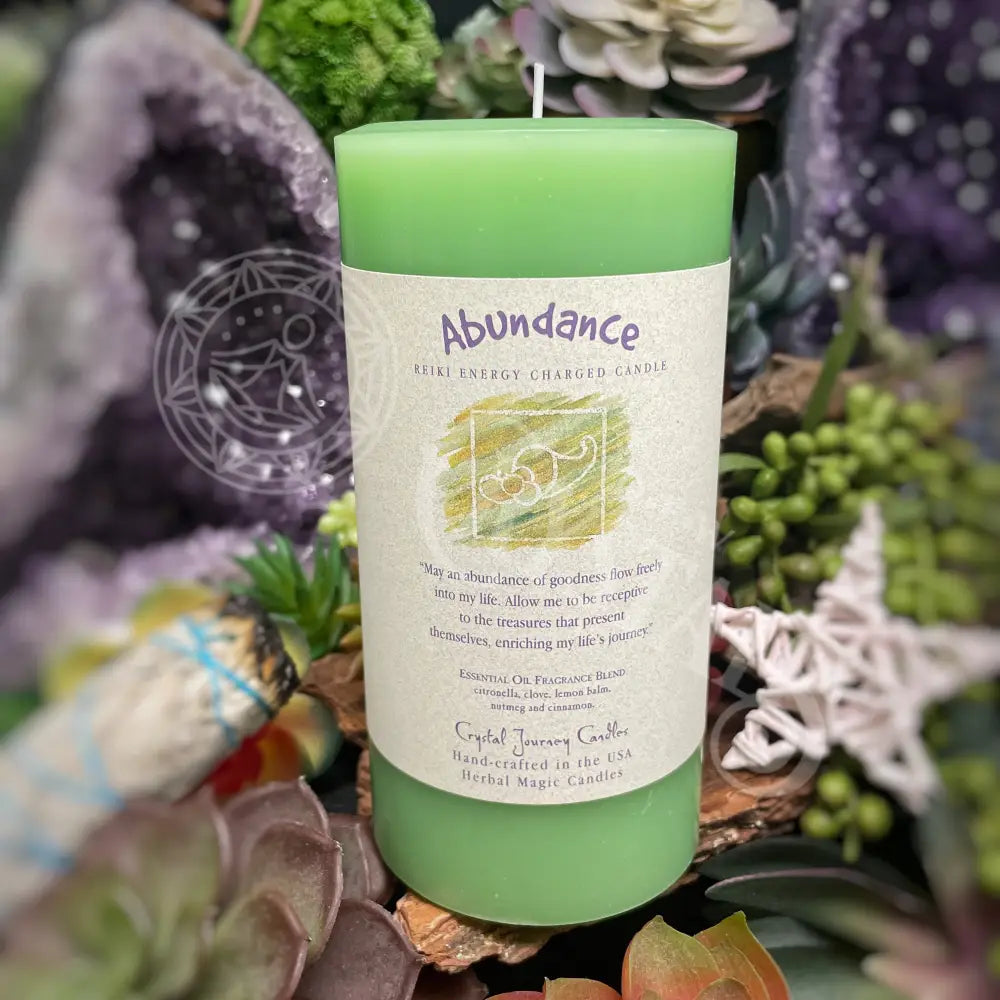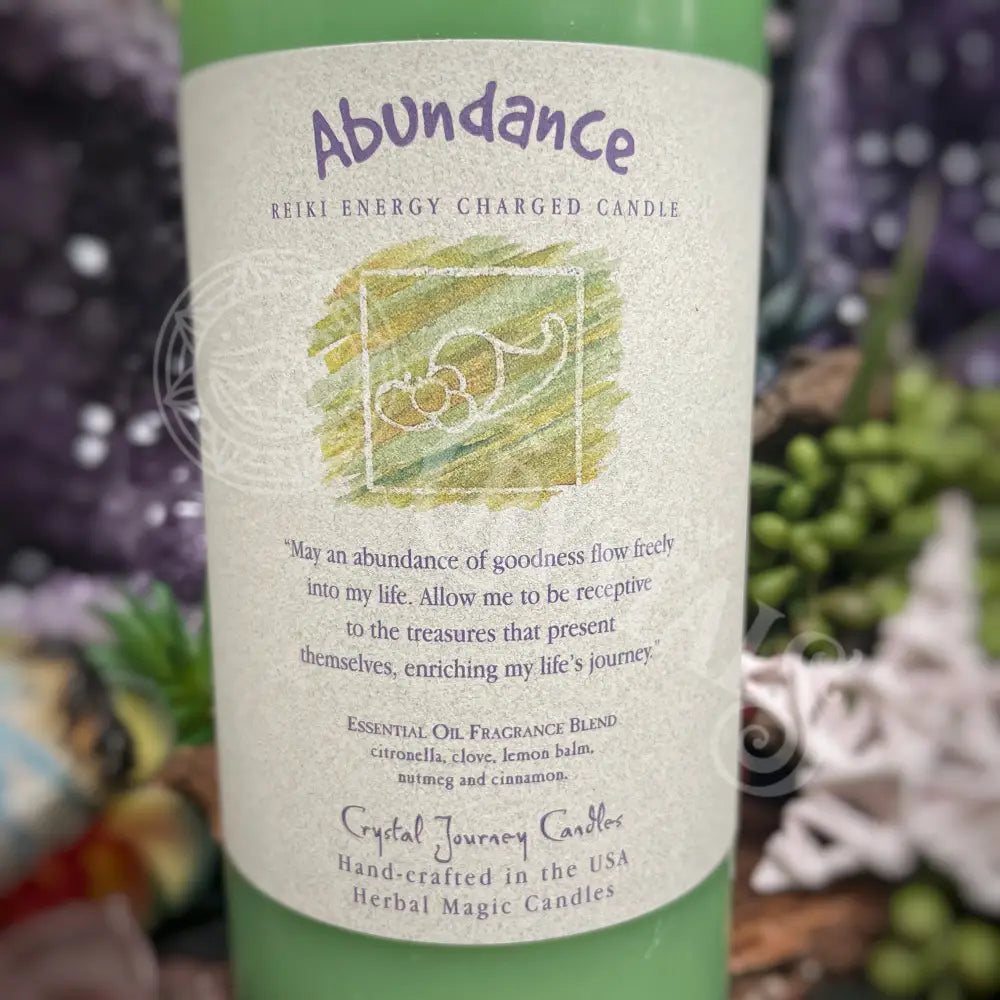 The Abundance candle includes a blend of citronella, clove, lemon balm, nutmeg, and cinnamon essential oils, with the affirmation: "May an abundance of goodness flow freely into my life. Allow me to be receptive to the treasures that present themselves, enriching my life's journey".