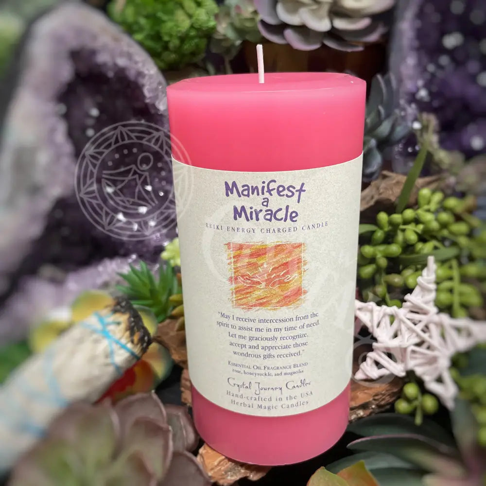 The Manifest a Miracle candle includes a blend of rose, honeysuckle, and magnolia essential oils, with the affirmation: "May I receive intercession from the spirit to assist me in my time of need. Let me graciously recognize, accept, and appreciate those wondrous gifts received".