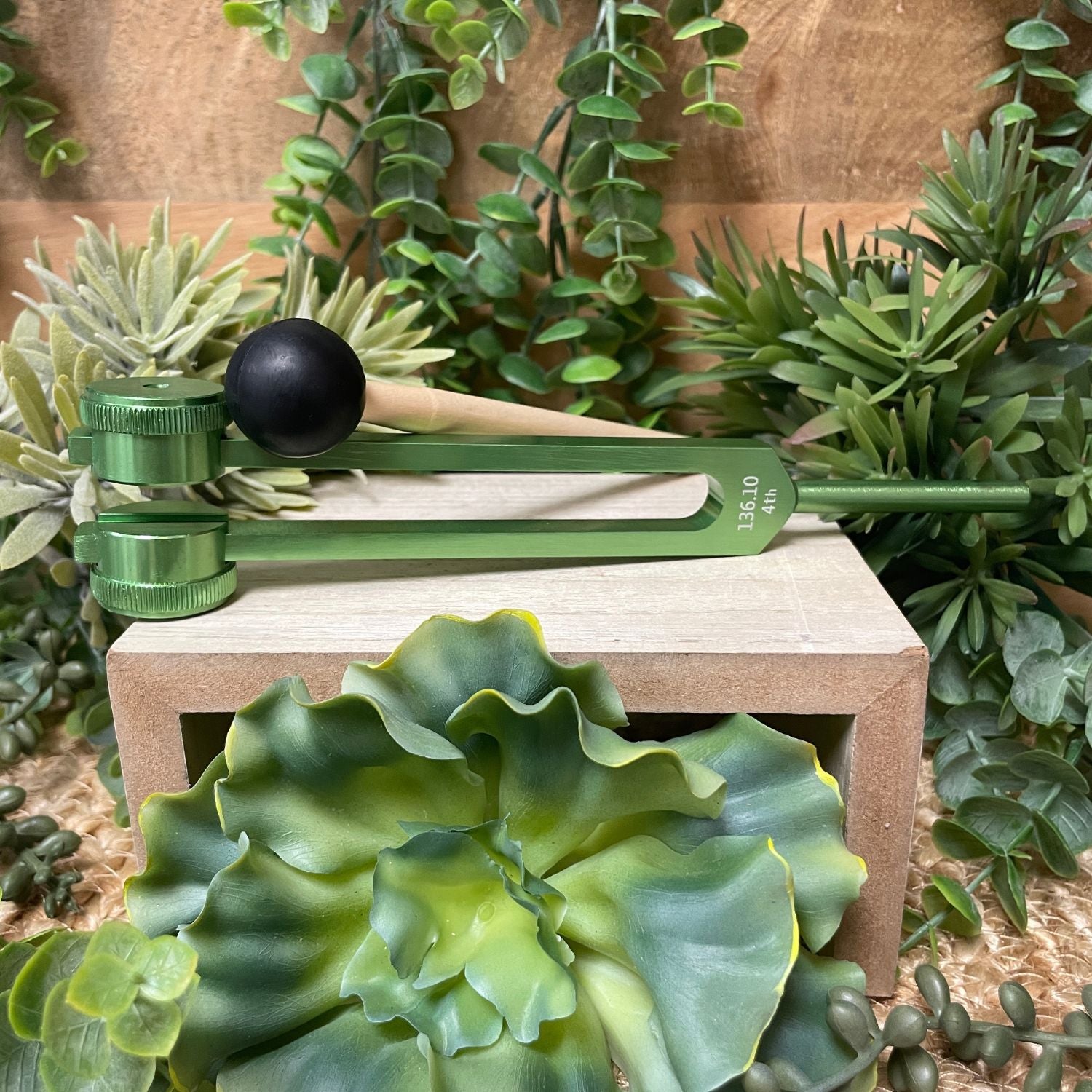 Gently strike the fork with the mallet and hold it near the body, above the chakra, or within the aura. Allow the vibration to flow through the energy center, dissolving tension, clearing stagnation, and promoting peace, expansion, and alignment.