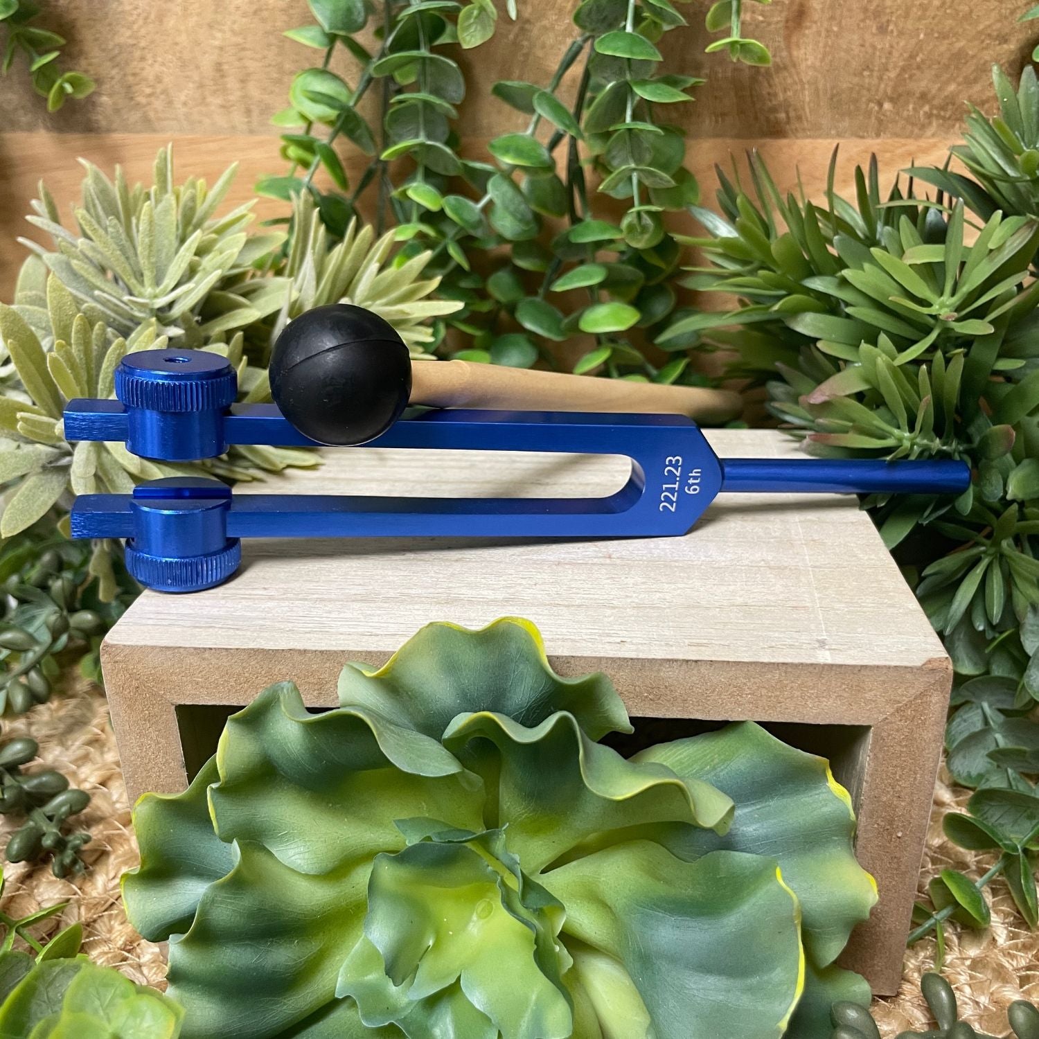 Gently strike the fork with the mallet and hold it near the body, above the chakra, or within the aura. Allow the vibration to flow through the energy center, dissolving tension, clearing stagnation, and promoting peace, expansion, and alignment.