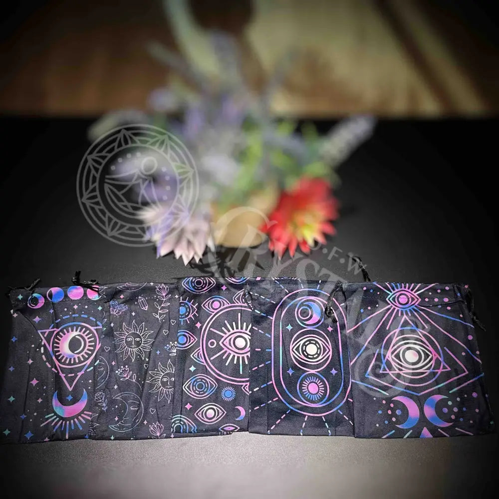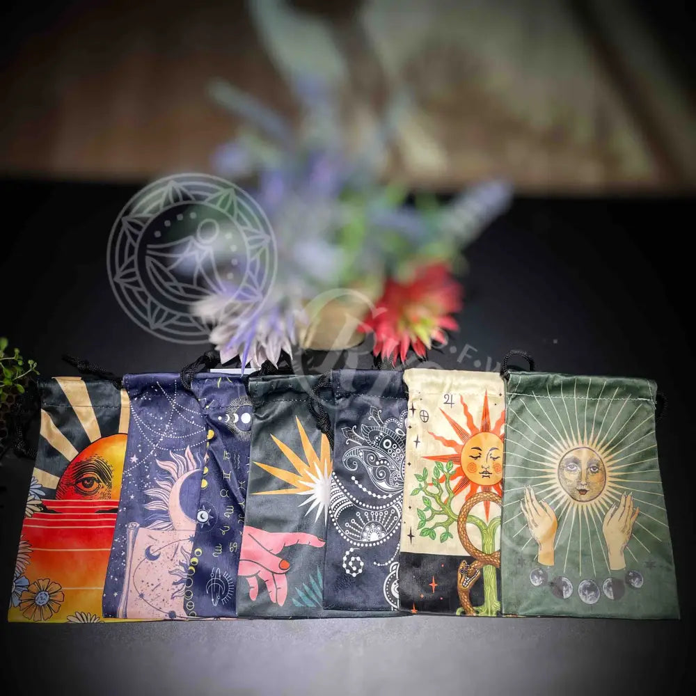 Store your tarot decks, oracle decks, crystals and other magical items in these versatile bags. Measuring approximately 6" wide and 7" tall, each bag comes with a convenient drawstring for easy access. Keep your treasures safe and organized!